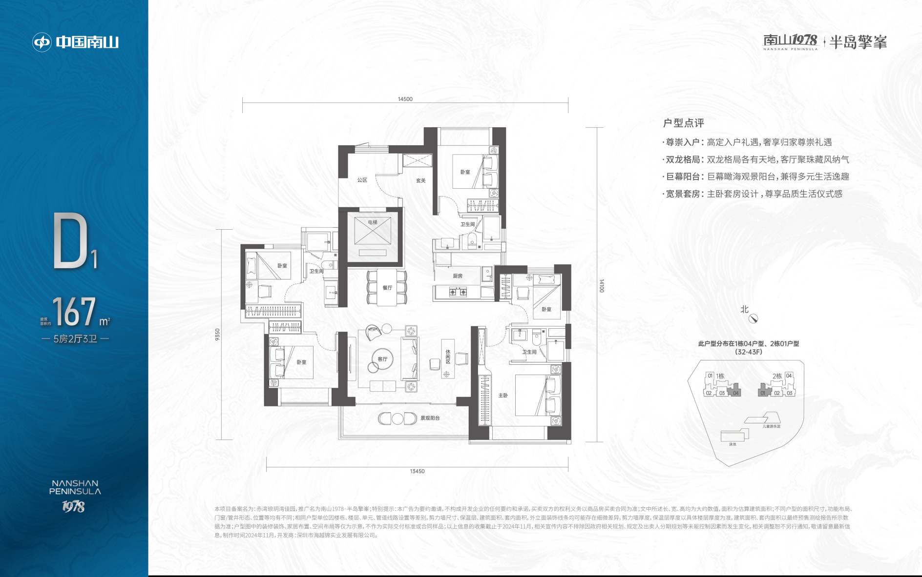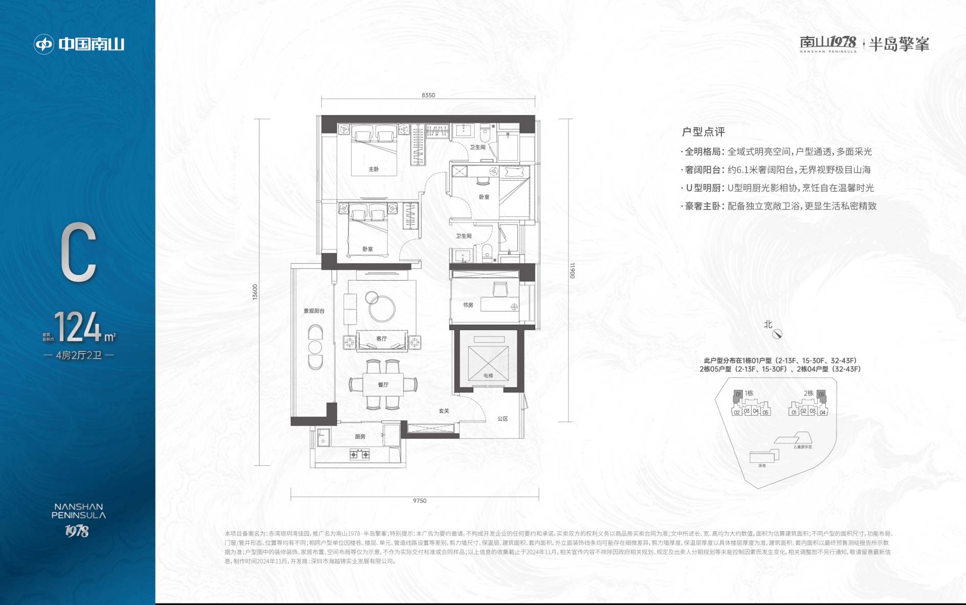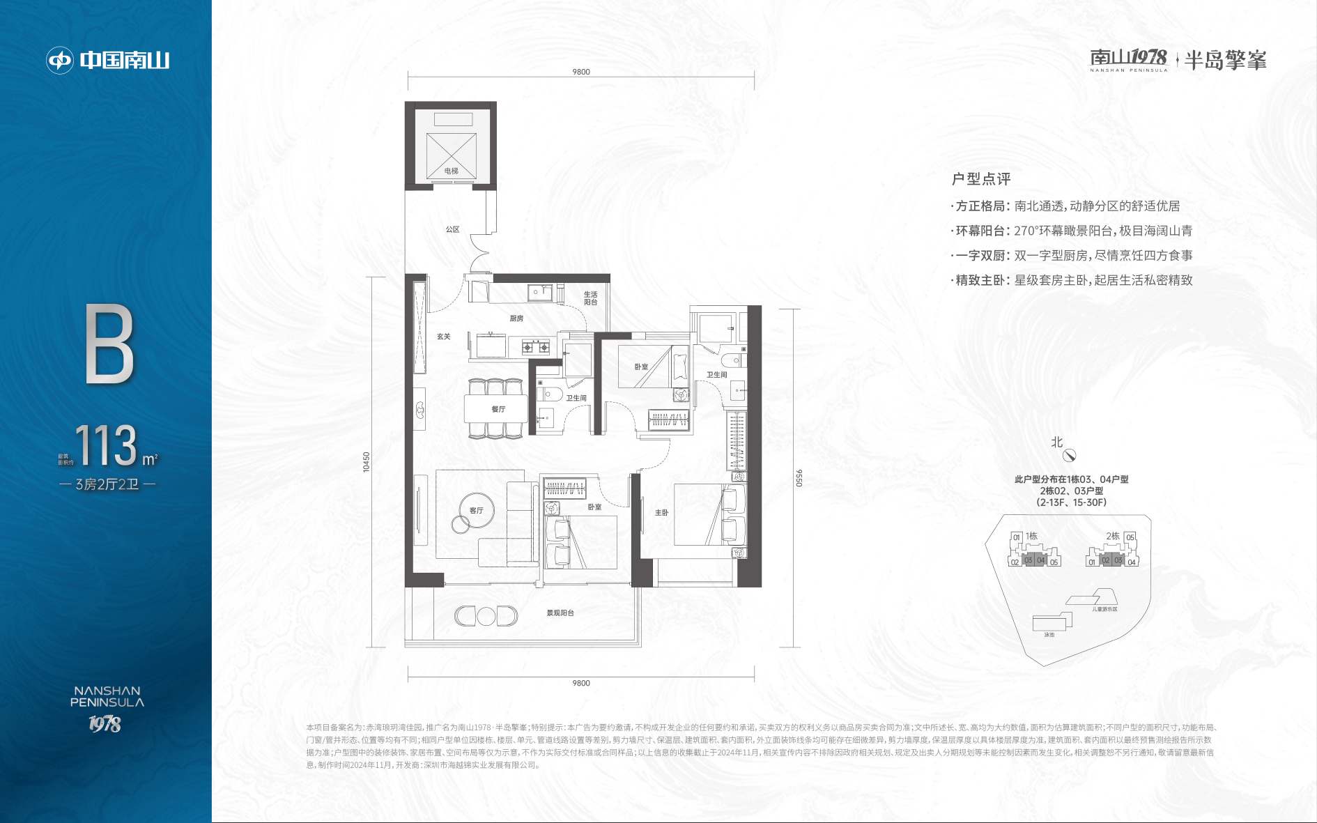 建面约113-167m3-5房一线海景臻邸,占据赤湾片区住宅群组团首排,享一线无遮挡海景;纯粹居住地块,无回迁房、保障房、商业、办公等其余业态,生活圈层纯粹,高品质居住氛围;大面采用灰色铝板和三层超白low-e玻璃类幕墙,纯正板楼设计,方正户型,南北通透,倚山瞰海低密住区;约4300㎡社区园林,以“海岛花园”为主题,使用皇家园林移步移景的设计打造手法;车库双大堂设计,大面积采用天然浅色石材,并于天然奢石加以点缀,光厅顶面采用金属构件,结合灯带,增加层次感,彰显项目高定品质;社区内配备了分龄段天幕双泳池、阳光草坪、全龄儿童活动区、四大主题多功能泛会所等社区活动场所。